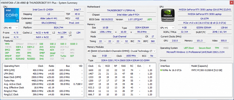- Thunderobot 911 MT Pro D с таким же, как у героя нашего обзора, процессором и несколько более продвинутой видеокартой NVIDIA GeForce RTX 3060 Laptop, SSD NVMe 512 ГБ PCIe 4.0 ×4, ОЗУ 16 ГБ (2×8) DDR4-3200,