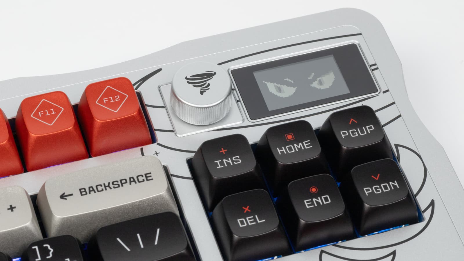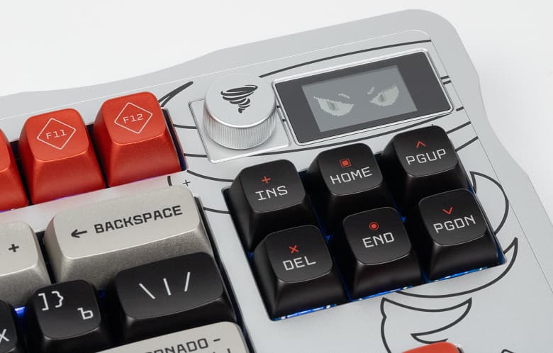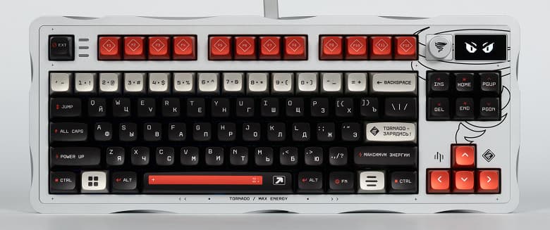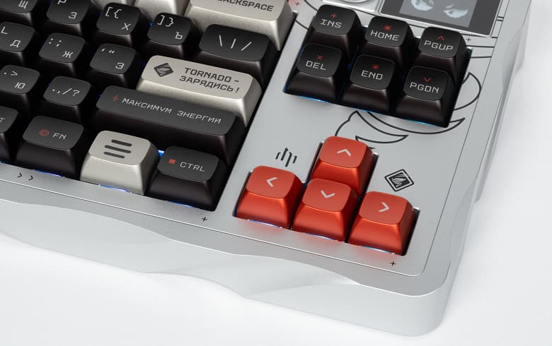 Что же касается живущего в клавиатуре «Торнадо», то он не так прост — хоть, по сути, и является чистым визуальным украшением. Маленький OLED-дисплей рядом с регулятором громкости просто показывает... разные эмоции, зависящие от того, что вы набираете на клавиатуре. Анализируется темп работы — например, если ничего не трогать дольше минуты, «Торнадо» впадает в спячку, а при темпе от 60 нажатий за 10 секунд немножко сходит с ума. Но это ещё не всё — специальные анимации предусмотрены и для некоторых комбинаций клавиш, часто используемых в чатах — типа GG, LOL или не совсем цензурного слова из четырёх букв. Рассказывать про всё это большого смысла нет — лучше смотреть. Или не смотреть, поскольку, естественно, функциональной нагрузки мимика «Торнадо» не несёт. Просто оживляет пейзаж. Зачем? Ну, во-первых, это красиво, а во-вторых — достаточно и во-первых. Такая маленькая шалость разработчиков в дорогом концептуальном продукте. Могут себе позволить для повышения концептуальности.