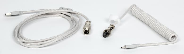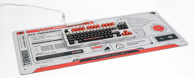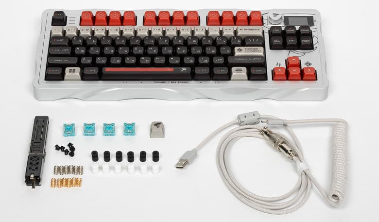 Комплект поставки непривычно богат — в частности, есть и съёмник для клавиш, запасные переключатели и даже ещё один кастомный кейкап с тем самым торнадо. Забавным элементом является интерфейсный кабель. Длина его два метра если специально не растягивать — свернутая «пружунка» позволит выжать ещё метр при сильной необходимости. Толстый в мощной тканевой оплетке, так что с ним вряд ли что-то случится в процессе эксплуатации.