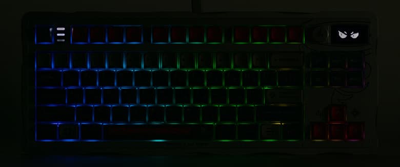 Обойтись без таковых при проектировании игровой клавиатуры просто невозможно. Здесь их на удивление не так и много. Та самая подсветка промежутков, да разноцветные клавиши и их подписи, разве что — но и последнее в меру. Хотя кому как — некоторым может не понравиться отсутствие цветового выделения WASD, а кто-то, наоборот, предъявит претензии к переименованию Tab в Jump. Но это уже всё чистая вкусовщина.