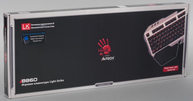 A4Tech Bloody B860 поставляется в простой картонной коробке тёмных оттенков. На фронтальной части по центру изображён окровавленный след ладони, а правее — левая часть клавиатуры с присоединённой специальной подставкой под запястье левой руки. На обратной стороне упаковки размещена информация о применённых переключателях и ключевые характеристики клавиатуры. В комплект поставки входят: