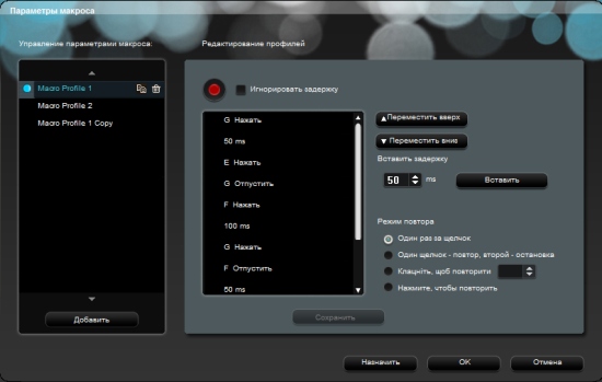 Макросы для GX810 можно только записать. Вручную вставляются лишь значения задержек. Прямо во время записи, кстати, можно включать или отключать их игнорирование. Максимальное число команд в одном макросе — 120. Имеются разные режимы повтора, включая «клацнiть щоб повторити» — как ни странно, более функциональный, чем «нажмите, чтобы повторить».