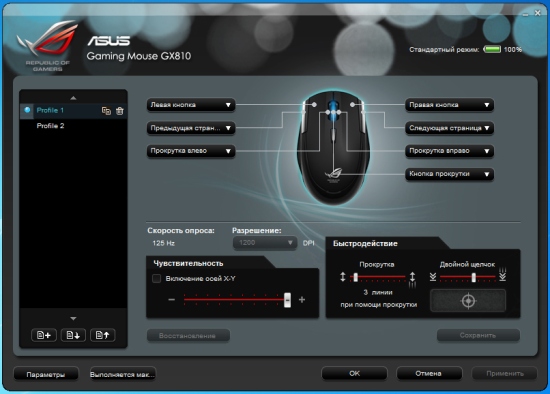 Под миниатюрным изображением GX810 находится ползунок чувствительности (с возможностью раздельной настройки по осям X и Y), количества пролистываемых при прокрутке линий (от 3 до 30) и скорости двойного щелчка. Опробовать последнюю можно в маленьком прямоугольнике с прицелом.