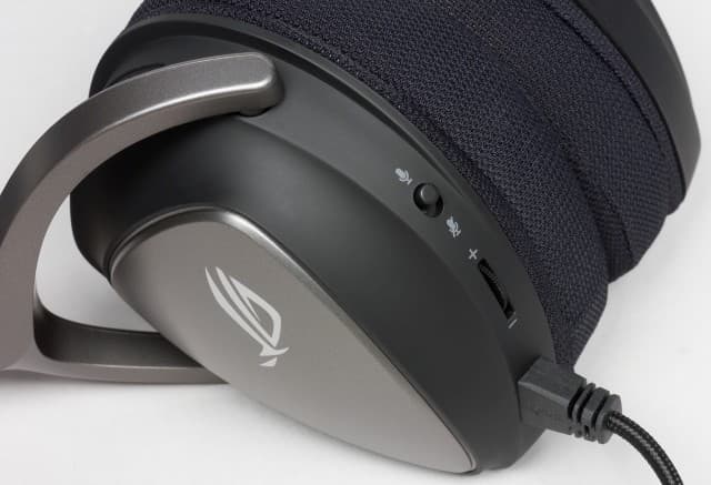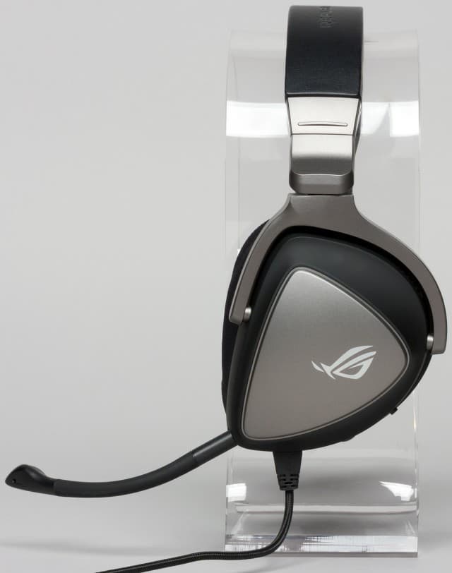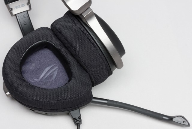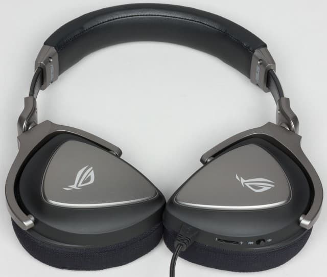 Гарнитура оформлена в строгих чёрно-серых тонах с акцентами серебристого цвета в виде логотипа ROG на чашках.