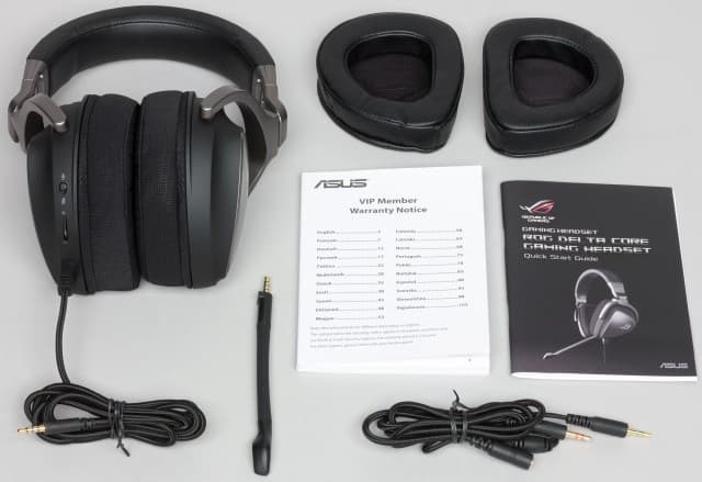 Гарнитура продаётся в картонной коробке, оформленной в чёрно-красных тонах, что традиционно для марки ROG. Наушники размещены в специальной форме для безопасной транспортировки. В коробочке для аксессуаров упакованы: кабель-удлинитель с двумя штекерами 3,5 мм для подключения к ПК, микрофон на гибкой штанге, пара сменных амбушюров из синтетической кожи, краткое руководство пользователя и брошюра с условиями гарантийного обслуживания.