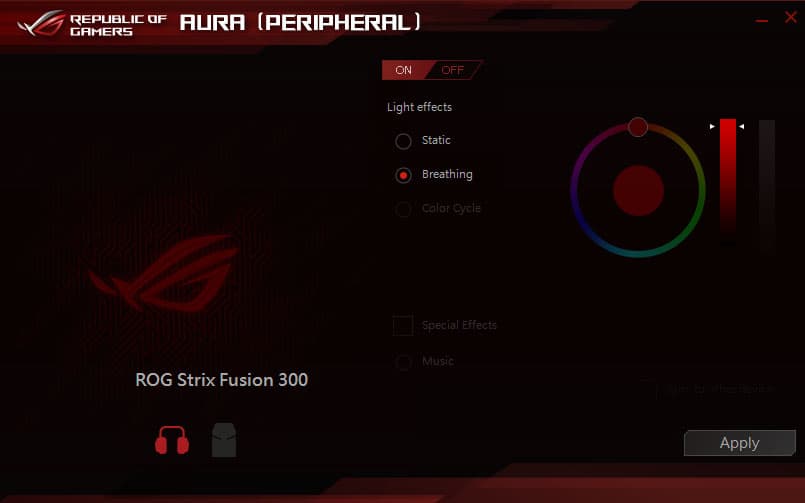 Для использования гарнитуры не требуется установка фирменного приложения, достал из коробки, подключил к ПК или к джойпаду консоли и вперёд в сражения. В общем, это удобно. Однако иногда для гарнитур выходят обновления прошивок. Поэтому мы зашли на официальный сайт и в разделе «Поддержка / Драйверы и утилиты» обнаружили ссылку на утилиту Aura Peripheral. После установки утилита позволяет отключить подсветку чашек гарнитуры или изменить яркость и режим работы светодиодов, выбрав между постоянным свечением и «дыханием».