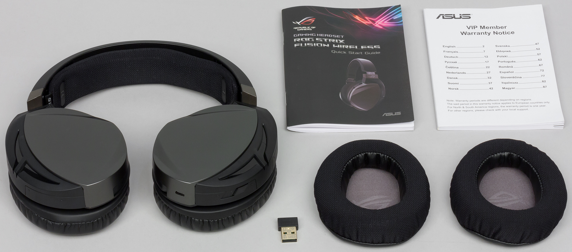 В комплекте находятся: гарнитура, USB-передатчик, амбушюры из искусственной кожи, амбушюры ROG Hybrid, гарантийная памятка и инструкция пользователя.