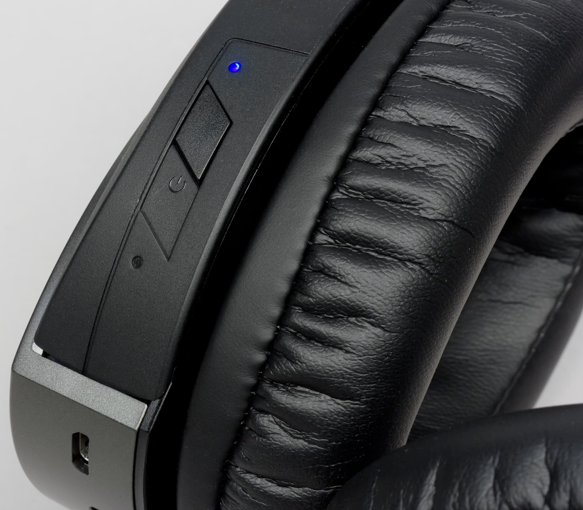 Остальные функциональные элементы расположены на нижней грани левой чашки. Здесь находится клавиша включения, индикатор работы и microUSB-порт для зарядки гарнитуры. Клавиша включения слегка утоплена в корпус, что способствует предотвращению случайных нажатий.