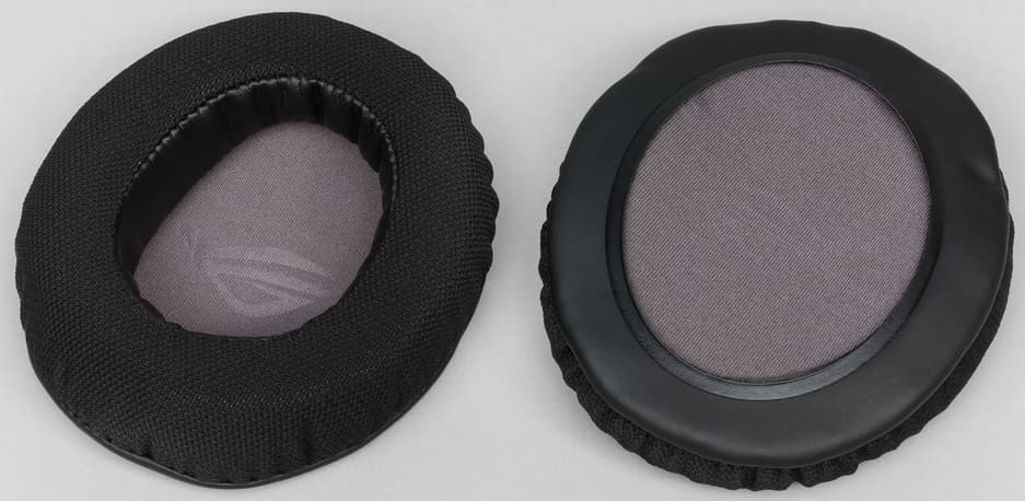 Вторые комплектные амбушюры под названием ROG Hybrid имеют комбинированное покрытие с использованием ткани, что обеспечивает более качественную вентиляцию и отсекает больше внешних шумов. Форма и размер амбушюр позволяют обеспечить качественное прилегание чашек к голове пользователя и не дают ушам касаться защитной ткани динамика.