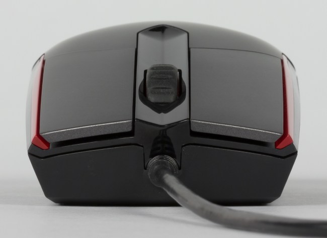 Кнопки мышки отделены от корпуса, что на официальной странице продукта преподносится как преимущество. Между кнопками находится крупная глянцевая вставка. Под колесиком много пустого места; сюда обычно помещают переключатель уровней DPI. Сам скроллер прокручивается четко выраженными шажками.