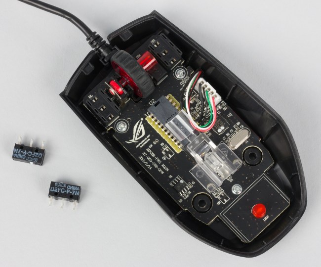Разобрать ASUS Sicaс. В пазах слева и справа находятся два одинаковых заменяемых переключателя для левой и правой кнопки мыши, а посередине — несменный для колесика. Извлекаются переключатели легко, двумя пальцами.