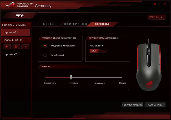 Для настройки мыши применяется утилита ROG Armoury, которую можно загрузить с официального сайта производителя. Набор ее возможностей стандартен: на каждую из пяти клавиш (включая колесико вверх/вниз) можно назначить свою команду — управление плеером, контекстное меню Windows, макросы.