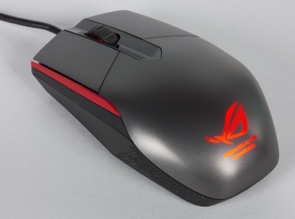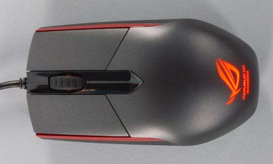 Основная часть корпуса изготовлена из серого пластика с практичным покрытием, не собирающим отпечатки пальцев. Оно обеспечивает несколько другие ощущения, чем популярный софт-тач, является более гладким на ощупь. По умолчанию логотип Republic of Gamers подсвечивается красным. Эту подсветку можно настроить через софт или выключить совсем, чтобы мышь не испускала никакого света. Ценная особенность для игрового манипулятора.