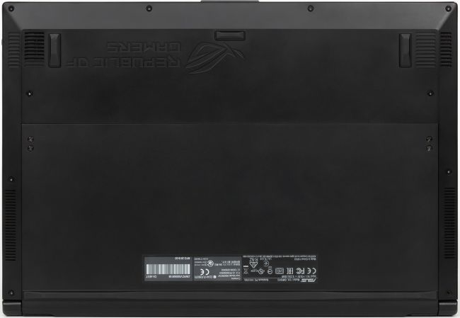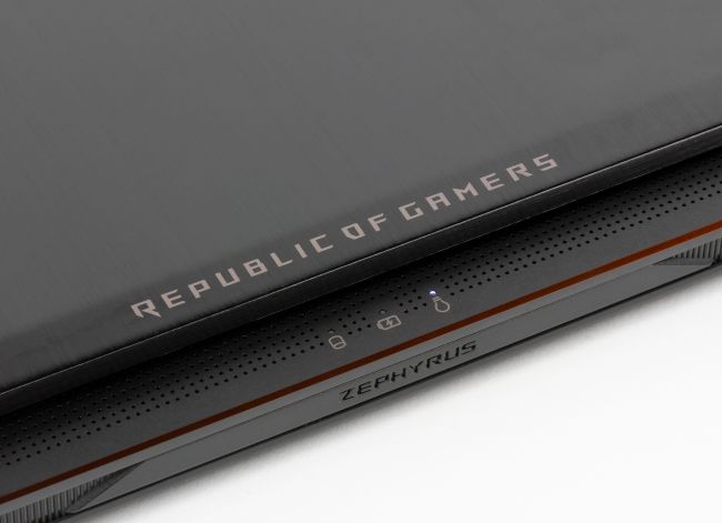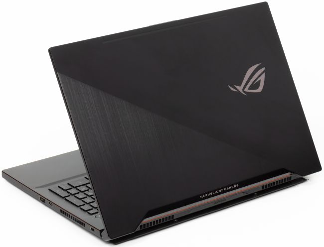 Корпус ноутбука изготовлен из алюминия и пластика. Крышка ноутбука сверху выполнена из тонкого листа алюминия с чёрным анодированным покрытием, на ней красуется подсвечиваемая эмблема игровой серии Asus ROG.