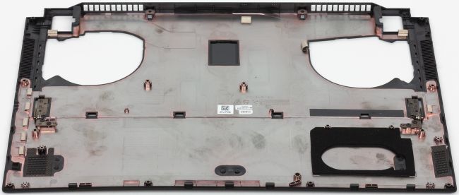 Нижняя панель корпуса выполнена из обычного чёрного матового пластика. На нижней панели нет никаких вентиляционных отверстий, но есть прорезиненная полоска, которая обеспечивает устойчивое положение ноутбука на горизонтальной поверхности.
