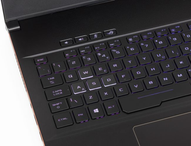 В ноутбуке Asus ROG Zephyrus M GM501GM используется клавиатура мембранного типа с увеличенным расстоянием между клавишами. Ход клавиш составляет 1,7 мм. Размер клавиш — 15,5×15,5 мм, а расстояние между ними — 3 мм.