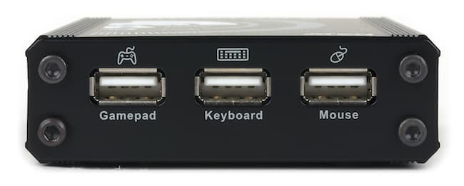 На передней панели находятся три USB-порта — для проводного геймпада, клавиатуры и мыши. Производитель упоминает, что беспроводную периферию также можно подключить, для чего требуется соединить с адаптером USB-ресивер. Но тут же оговаривается, что поддерживаются не все беспроводные модели.