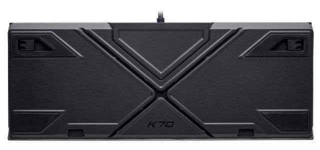 Корпус клавиатуры, за исключением алюминиевой лицевой поверхности, выполнен из пластика. Сзади есть две ножки, чтобы изменить высоту наклона клавиатуры, и два желобка, идущих крест-накрест. Эти углубления служат для укладки проводов сопутствующих устройств, например мышки или гарнитуры. Провод клавиатуры туда при всём желании не поместится, поскольку он чрезвычайно толстый. Это обусловлено не столько защитной оплёткой, сколько тем, что в нём находится сразу два USB-провода. Один питает клавиатуру, а второй идёт к USB-порту, который расположен на верхней грани клавиатуры по центру.
