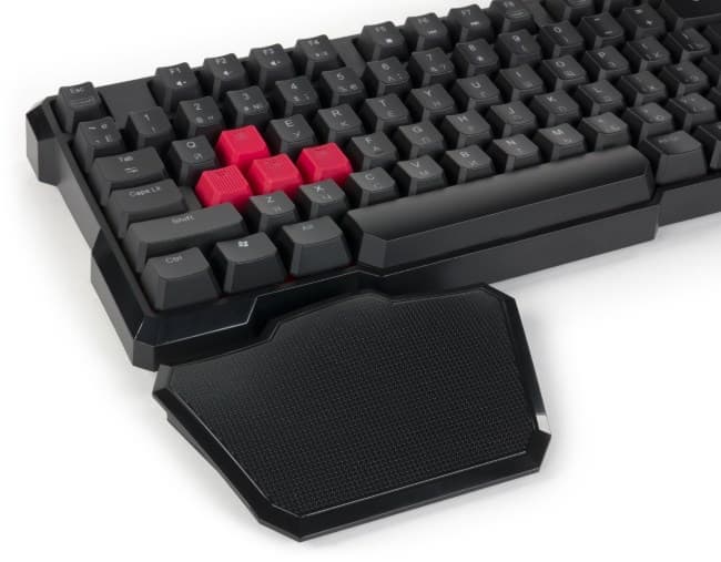 Подставка для запястья просто подкладывается под клавиатуру и вставляется в специально отведенный паз. Соответственно, при перемещении клавиатуры нужно придерживать и подставку. Она отстоит от манипулятора на небольшом расстоянии, что положительно сказывается на удобстве, но не на компактности.