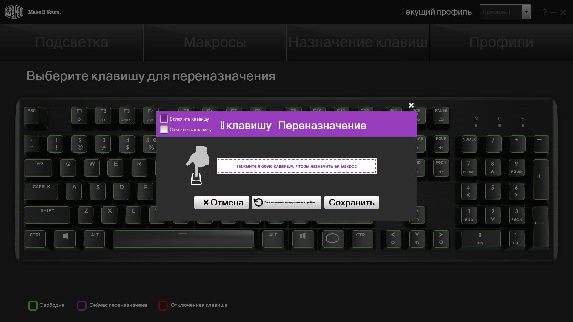 Третий экран позволяет переназначать клавиши и вешать на них различные макросы. Кроме того, есть возможность отключать отдельные клавиши.
