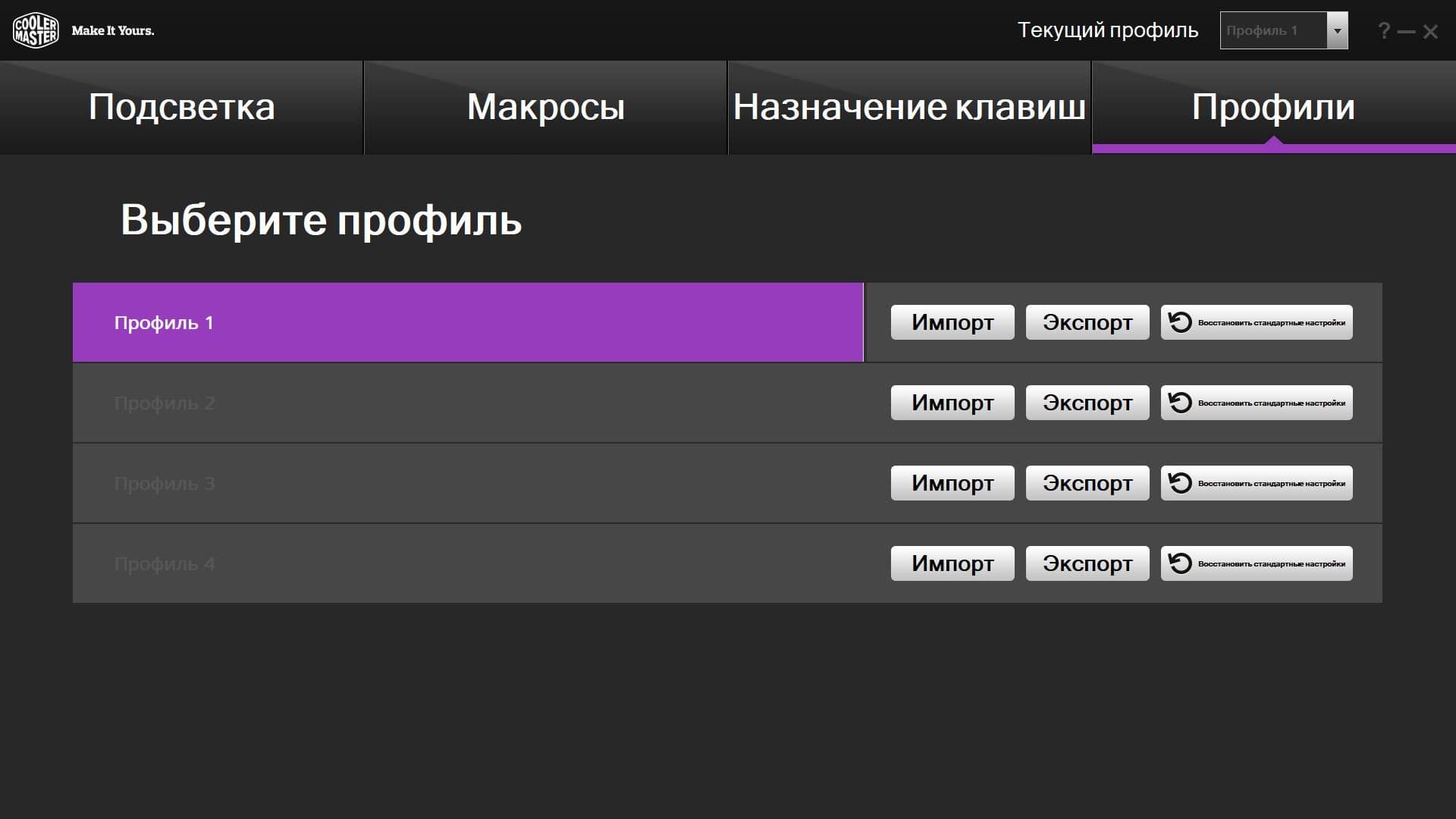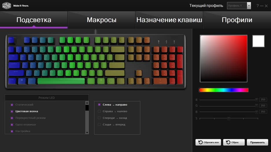 С официального сайта можно скачать программу Cooler Master Portal, позволяющую тонко настраивать режимы подсветки, записывать и редактировать макросы, создавать различные профили и обновлять прошивку устройства.
