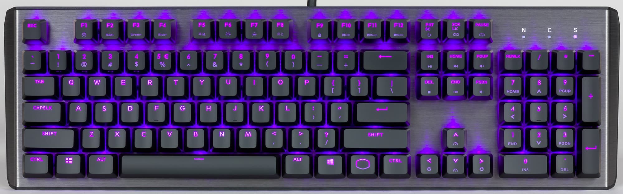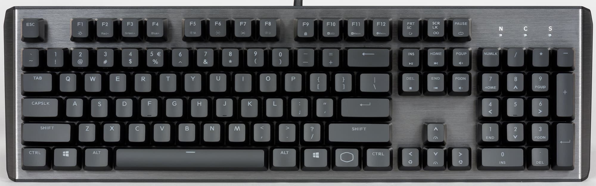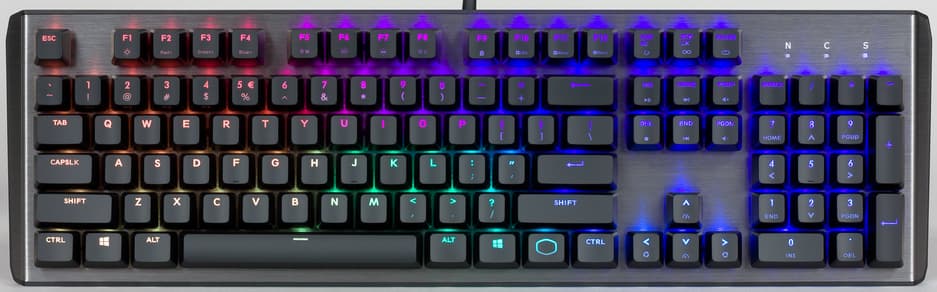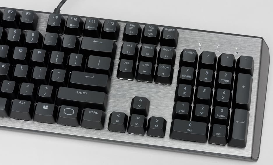 Количество клавиш — 104, компоновка стандартная, клавиша Enter однорядная. Расстояние между колпачками и их размер также стандартные и подразумевают возможность кастомизации (выделение WASD-блока, к примеру). В правом верхнем углу расположена индикаторная группа (Scroll Lock, Num Lock и Caps Lock).