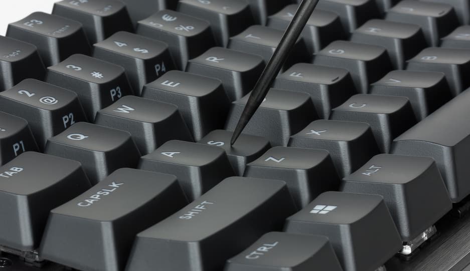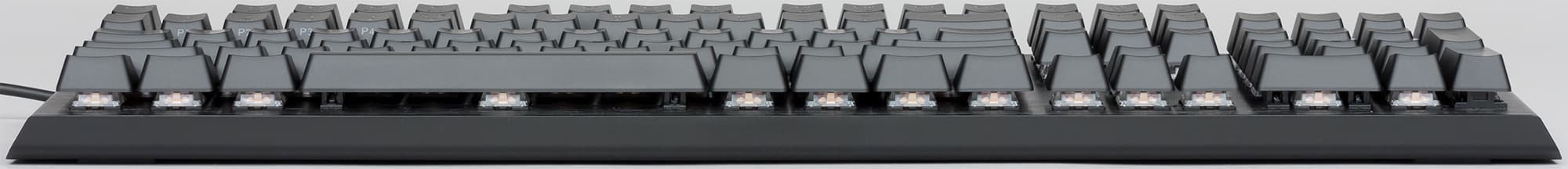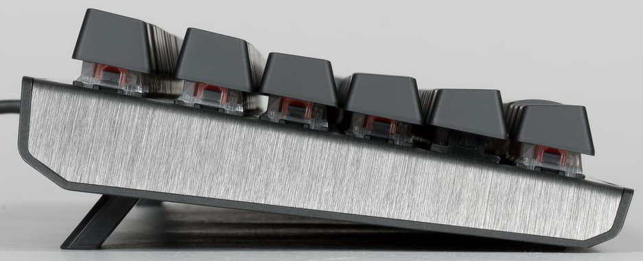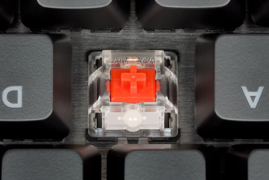 Сердцем каждой клавиши является переключатель Gateron Red, значительно отличающийся от распространённых синих и коричневых переключателей. Здесь тактильный отклик и щелчок практически не ощущаются, что с головой компенсируется лёгкостью хода и плавностью работы. Срабатывание происходит приблизительно в середине хода клавиши. Небольшое усилие, требуемое для нажатия клавиши, позволит вам не молотить по клавиатуре в суматохе боя, а спокойно нажимать нужные клавиши. Можно сказать, что красные переключатели в данной клавиатуре дают пользователю чуть меньше контроля за срабатыванием, однако позволяют быстрее нажимать различные комбинации клавиш.