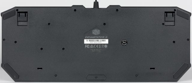 На днище клавиатуры расположены четыре резиновые пластины, которые предотвращают скольжение клавиатуры по поверхности стола. Помимо них на днище также есть две выставные ножки, которые изменяют угол наклона клавиатуры относительно стола на 15 градусов.