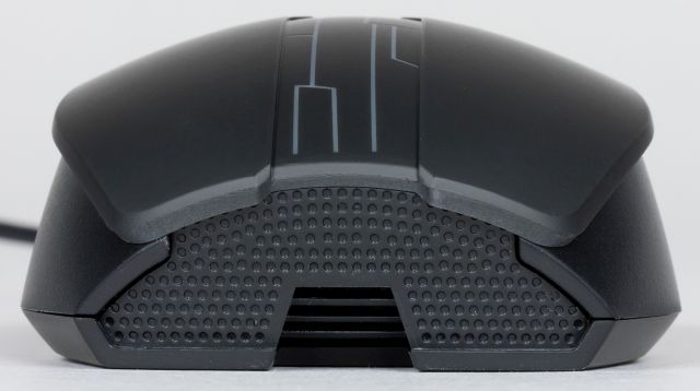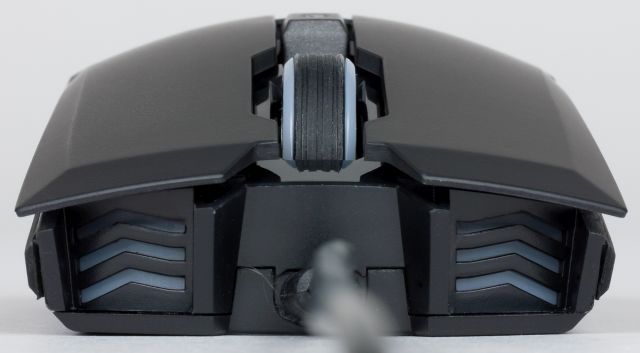 На левом боку мыши расположены две навигационные клавиши, а чуть ниже резиновая мягкая вставка, которая почти не пачкается и приятна тактильно. Аналогичная пластина размещена и на правом боку мыши. В результате мышь надёжно удерживается большим пальцем и мизинцем. Между ЛКМ и ПКМ находится колесо прокрутки, внешний обод которого выполнен из рельефного прорезиненного покрытия. Диаметр колеса прокрутки равен 26 мм.