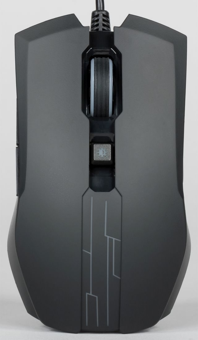Игровая мышь из комплекта Cooler Master Devastator 3 оформлена в похожем «космическом» стиле, как и клавиатура. Контур устройства при взгляде перпендикулярно сверху выглядит как прямоугольник. На деле такая форма корпуса является не самым удачным решением. Обладая даже относительно большой ладонью, вам не удастся обхватить мышь, остаётся ощущение дискомфорта.