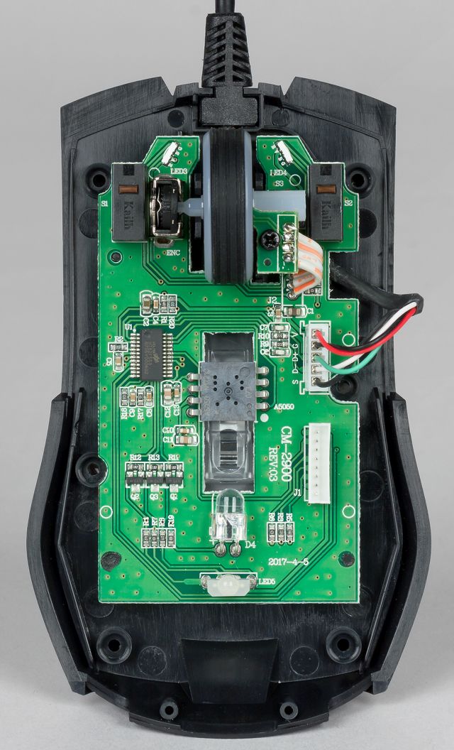Здесь можно рассмотреть маркировку оптического сенсора: Pixart A5050. В качестве контроллера применён чип Holtek HT82F553.