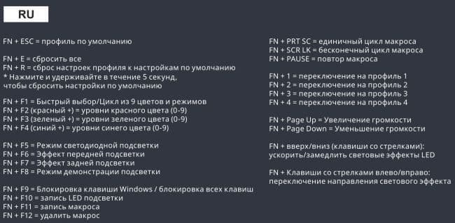 Поговорим о подсветке. Её настройка может быть выполнена двумя способами: на лету при помощи комбинации клавиш или при помощи фирменного ПО Portal. При комбинировании Fn+F1 вы меняете цвет текущего режима, например: изначально у вас был режим радужная волна, где цвет постоянно менялся, а потом после нажатия Fn+F1 у вас задействован только красный цвет. При повторении сочетания Fn+F1 вы меняете цвета последовательно: яркий зелёный, яркий красный, яркий синий, яркий фиолетовый и так далее, но при желании вы можете выбирать оттенки при помощи комбинирования клавиш Fn+F2 (красный), Fn+F3 (зелёный) или Fn+F4 (синий). У каждого оттенка есть 10 уровней яркости. Сочетание Fn+F5 меняет режим работы подсветки последовательно по списку, который можно настроить через фирменное ПО, отключив ненужные режимы. Всего предусмотрено десять режимов подсветки: статичный, радужная волна, прицел, затухание, дождь, настраиваемый, звёзды, дыхание, сонар и смена цветов. Все остальные комбинации клавиш, которых очень много, приведены в руководстве пользователя: