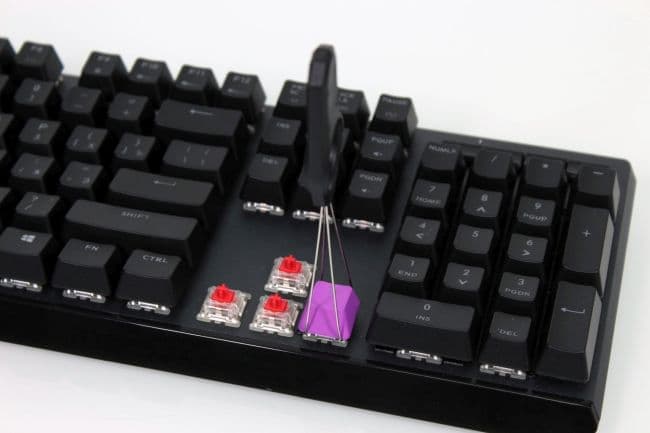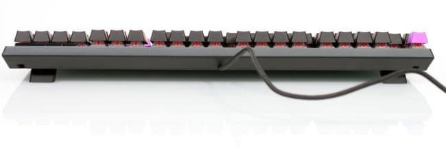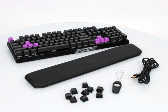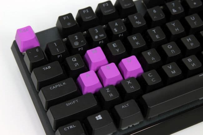 Разумеется, есть и такие обязательные атрибуты, как использование механических переключателей Cherry MX Red, приличная масса устройства, что гарантирует устойчивость на поверхности стола, и строгий, но стильный дизайн, включающий сменные колпачки фиолетового цвета.