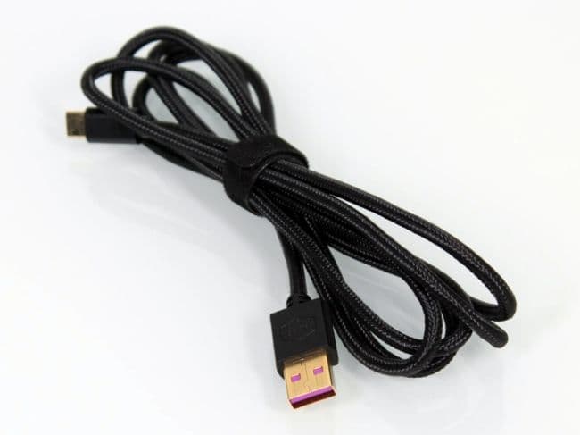 Это позволяет рационально вывести кабель для подключения к порту USB на ПК или хабе. Отметим маленький штрих: штекер USB-A фиолетового цвета. Как видно, стилистически цветовое решение продумано до мелочей. Никаких излишеств, всё гармонично.