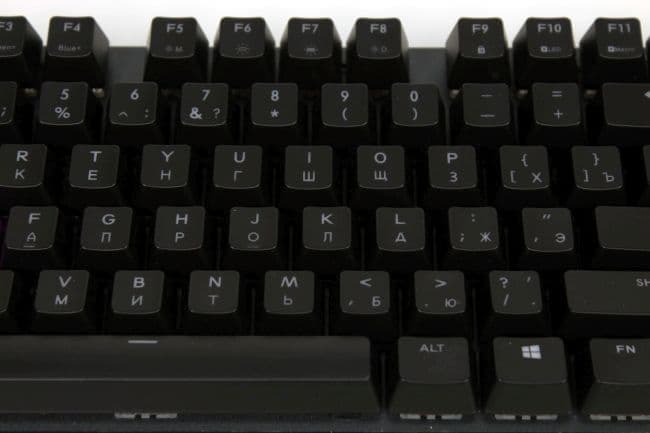 Высота латинских символов равна 5 мм, а кириллицы — 4 мм, причём их шрифт тоньше. Светодиод в переключателях Cherry MX смещён к верхней стороне клавиши, поэтому символы латиницы освещены лучше. Впрочем, символы кириллицы всё равно хорошо читаемы.