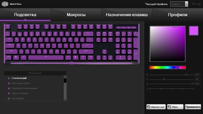 В первой вкладке вы можете настраивать количество включённых режимов подсветки и саму подсветку для каждой из клавиш индивидуально. Также имеется RGB-палитра в правой части.