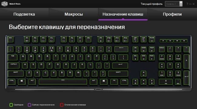 В разделе «Назначение клавиш» вы можете заменять действия одних клавиш на другие или вовсе отключать ненужные. Назначение макросов или запуск каких-либо приложений не предусмотрены.