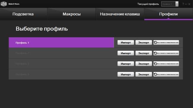 В разделе «Профили» можно выполнять разные манипуляции с сохранёнными наборами настроек, импортировать/экспортировать ранее созданные профили. Некоторые надписи выполнены мелким шрифтом, но вполне различимы.