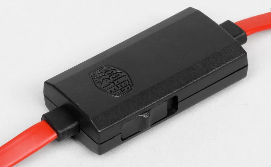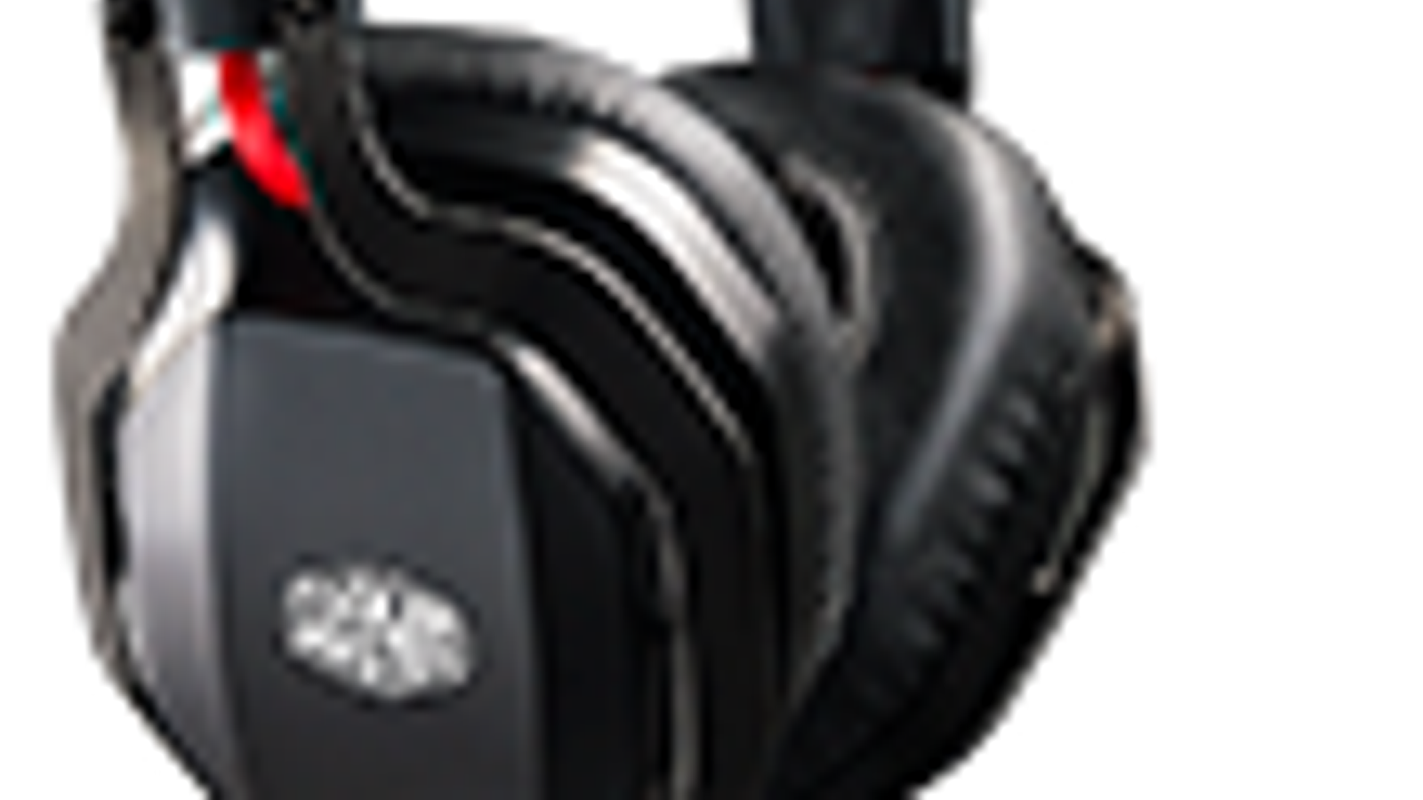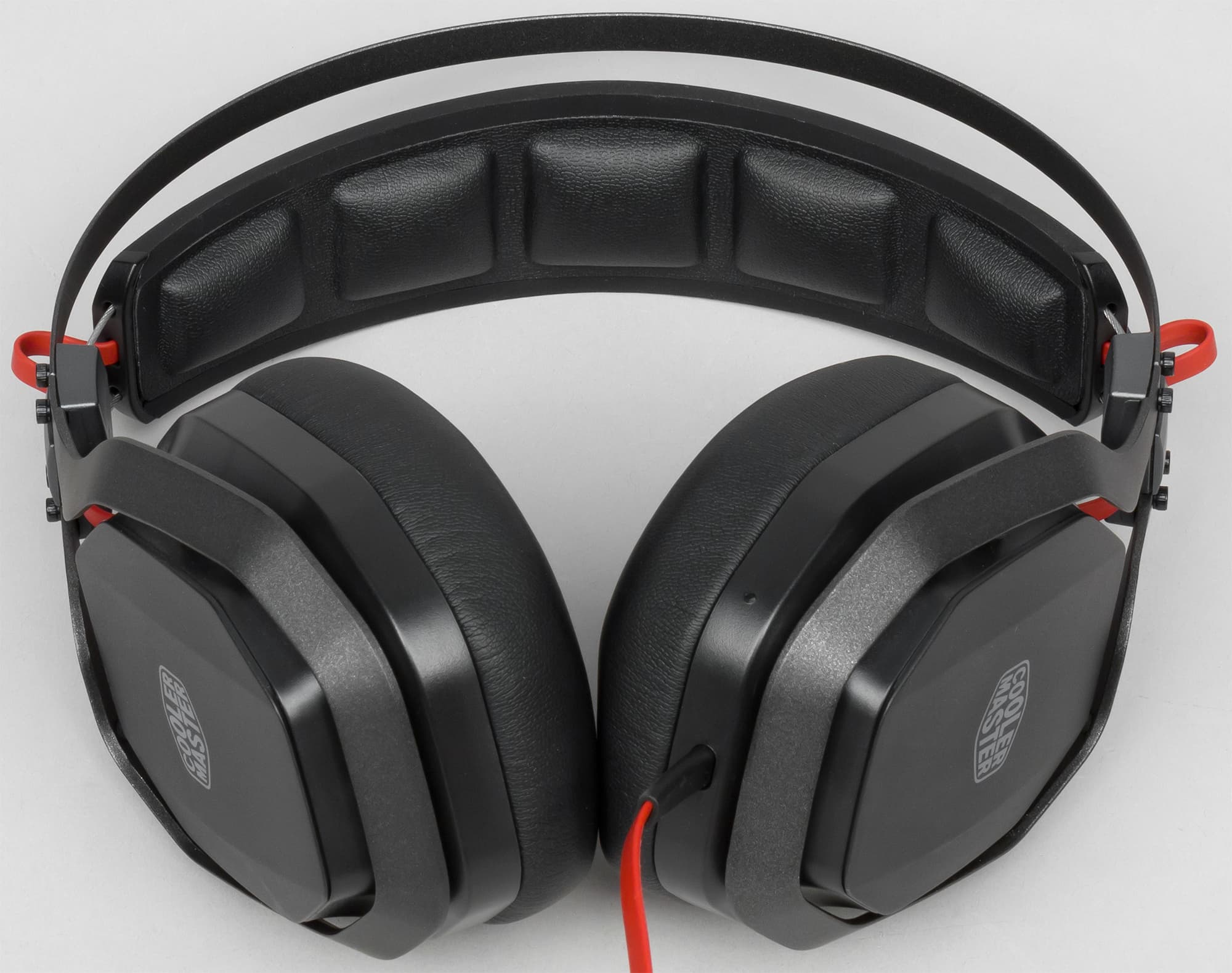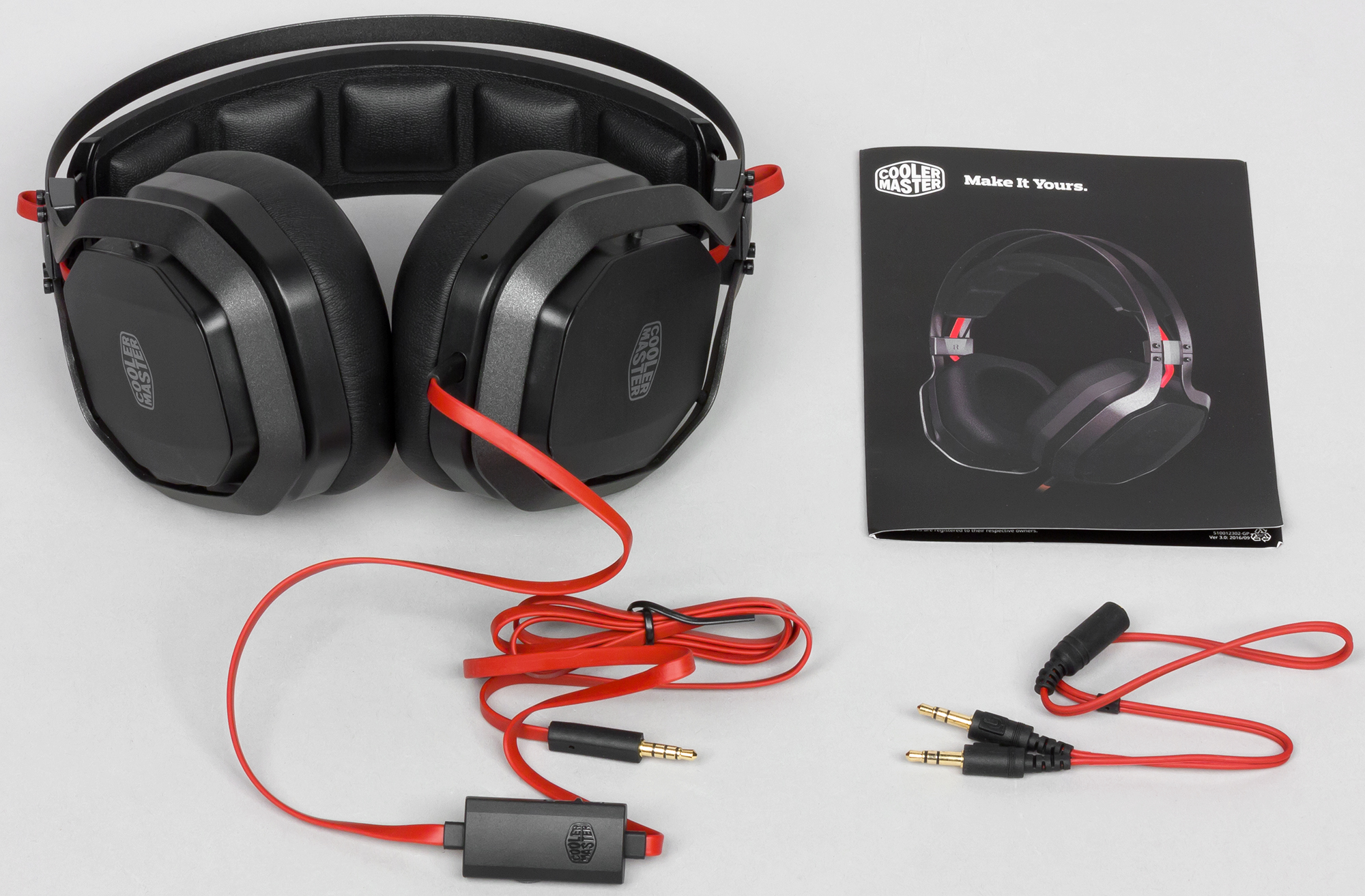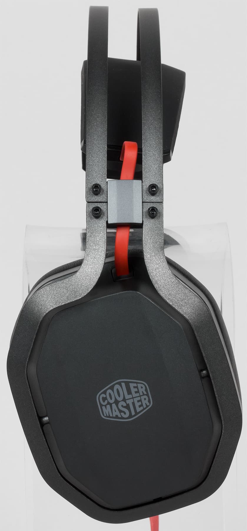 Крепление чашек также выполнено из металла и находится рядом с рельсами оголовья. Корпус чашек прикреплён к основанию с помощью шарнирного механизма, способного вращаться вокруг горизонтальной оси, подстраиваясь под геометрию головы пользователя. Подстройка в вертикальной оси отдана на откуп большим съёмным амбушюрам. Боковые крышки чашек с прозрачным логотипом Cooler Master закреплены на магнитах и снимаются, реализуя тем самым технологию BassFX.