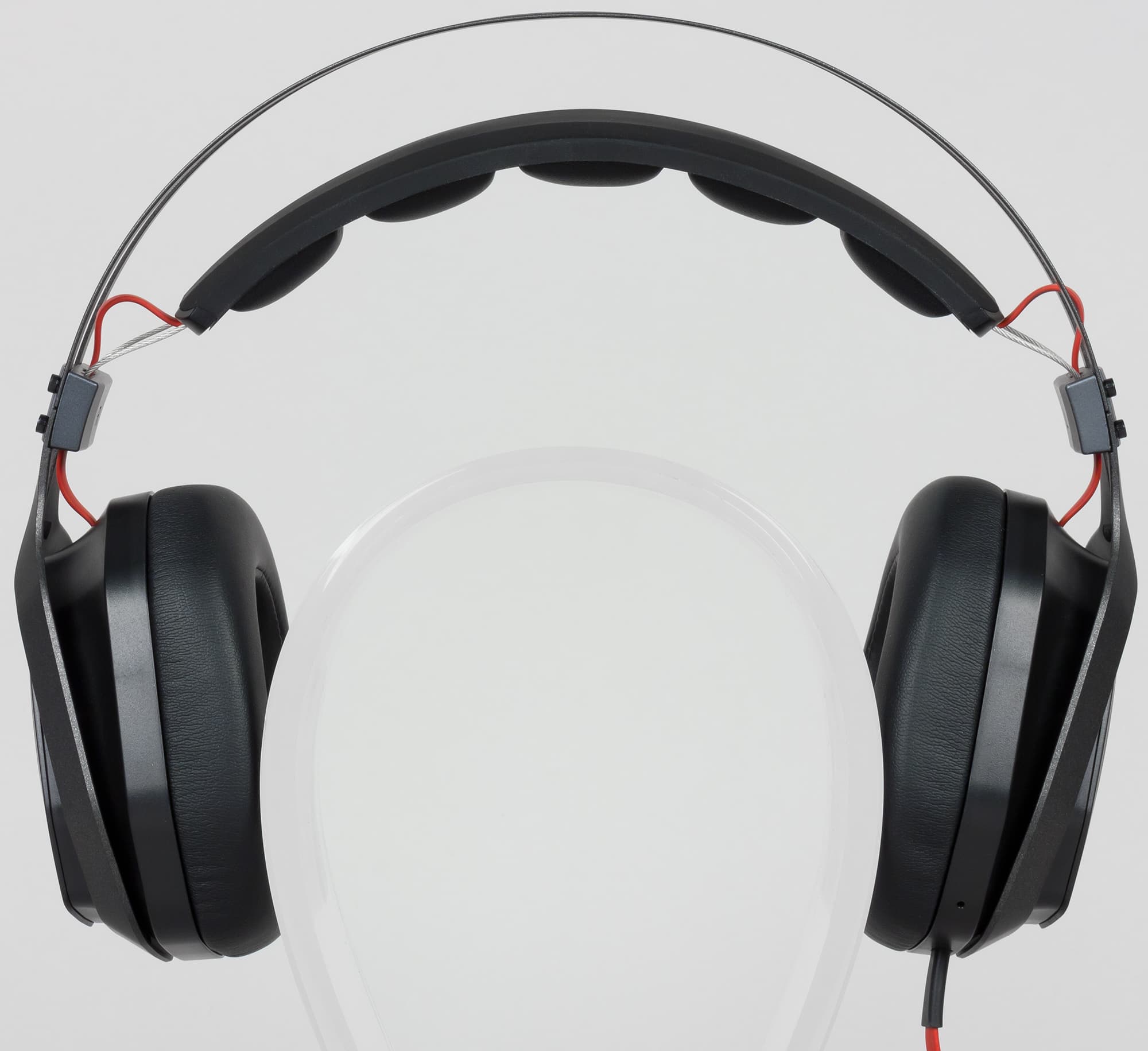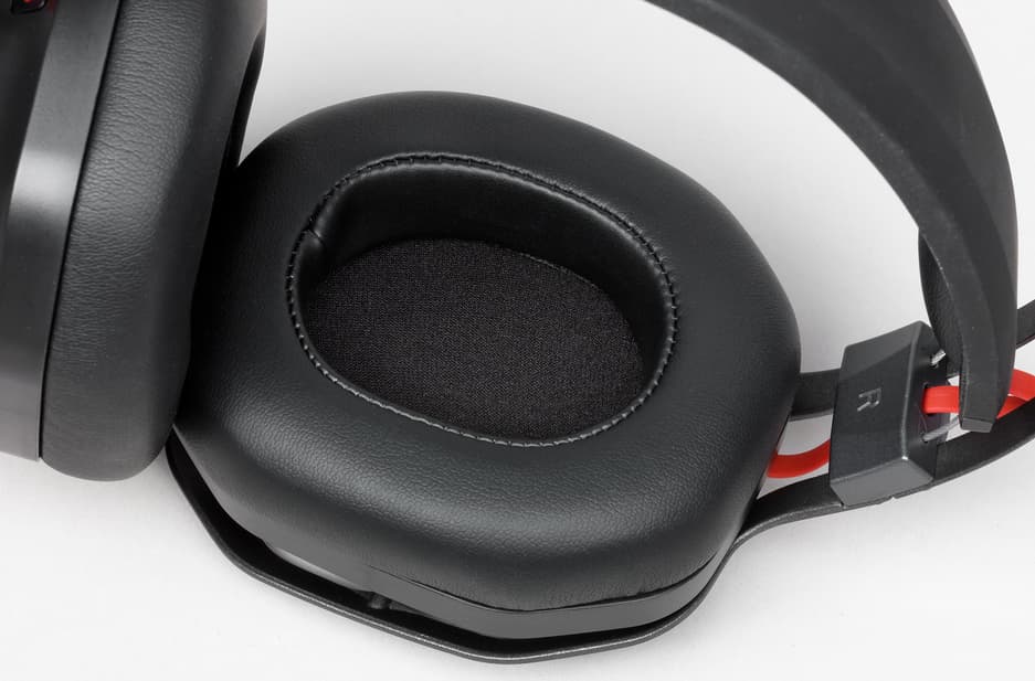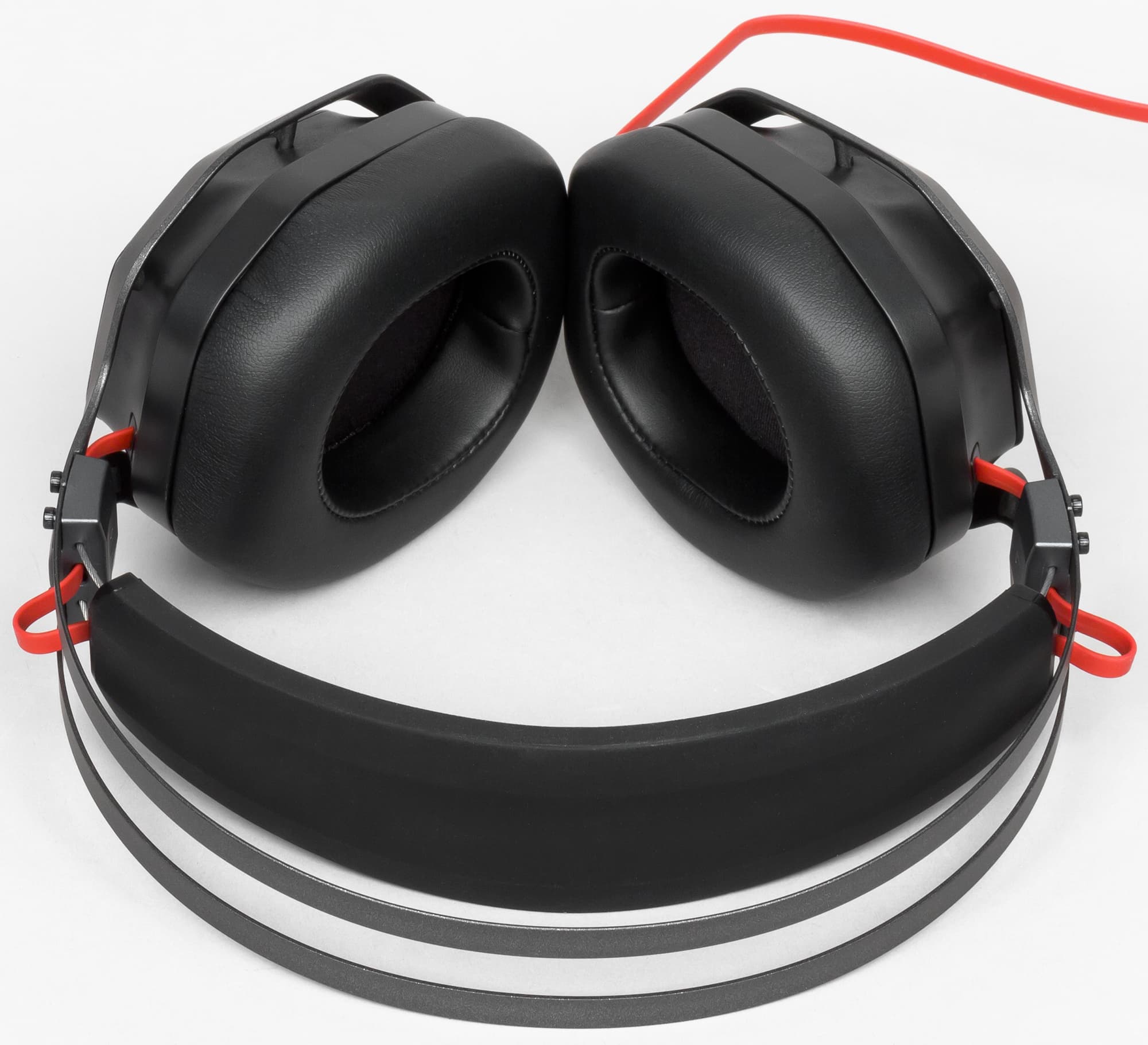 Амбушюры выполнены из экокожи с мягким наполнителем. Размер позволяет ушам практически не касаться внутренней защитной сетки и обеспечивает вполне удобную посадку. Давление на уши небольшое. Чашки соединяет между собой плоский кабель красного цвета, минимизирующий возможность поломки от постоянного использования.
