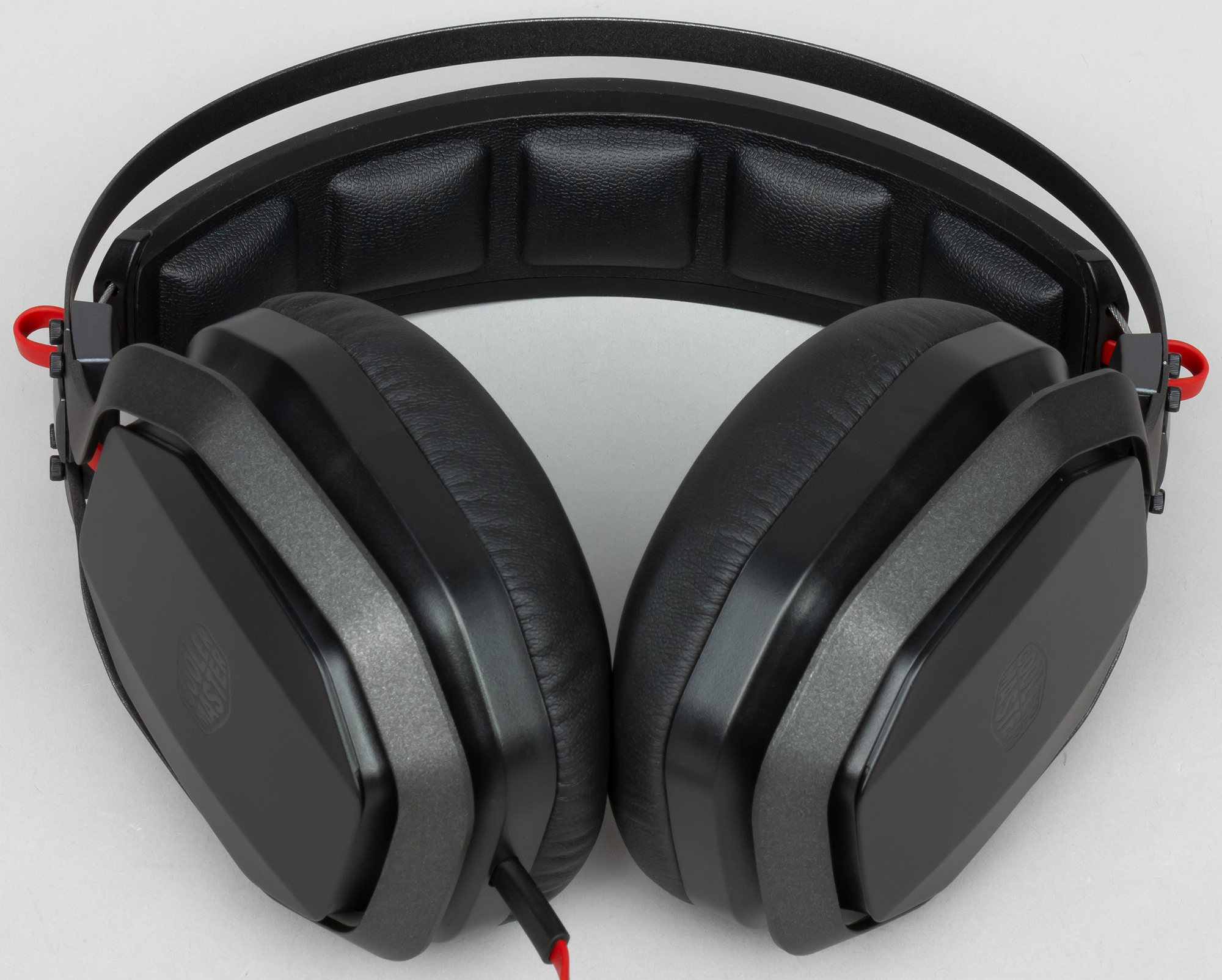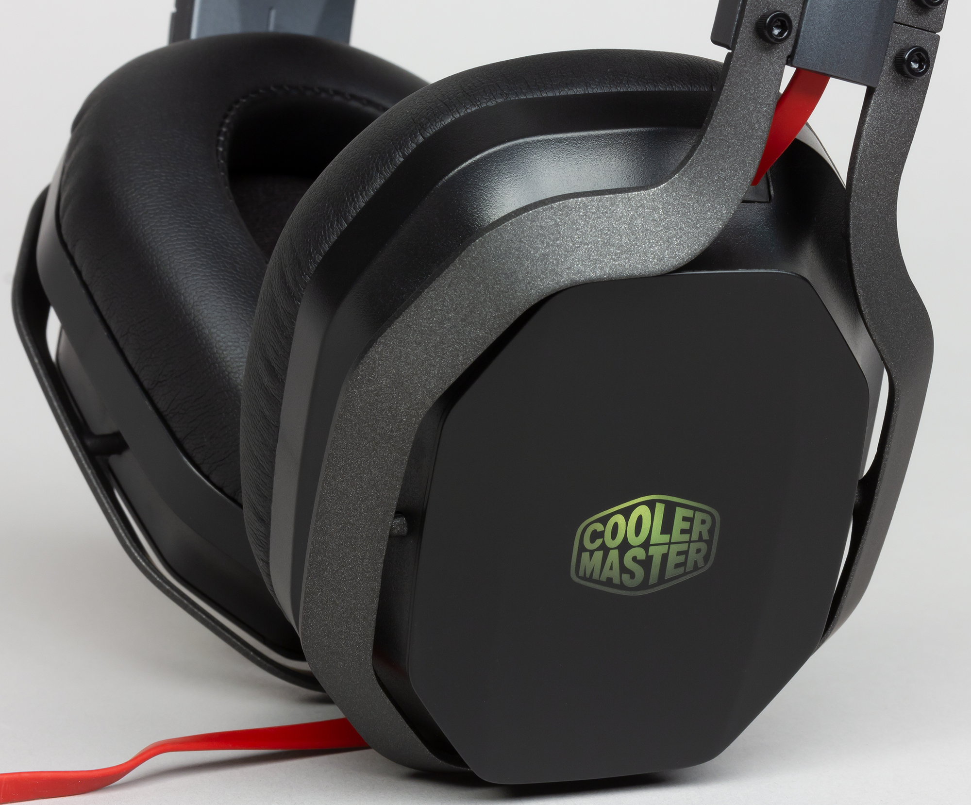 Крепление чашек также выполнено из металла и находится рядом с рельсами оголовья. Корпус чашек прикреплён к основанию с помощью шарнирного механизма, способного вращаться вокруг горизонтальной оси, подстраиваясь под геометрию головы пользователя. Подстройка в вертикальной оси отдана на откуп большим съёмным амбушюрам. Боковые крышки чашек с прозрачным логотипом Cooler Master закреплены на магнитах и снимаются, реализуя тем самым технологию BassFX.