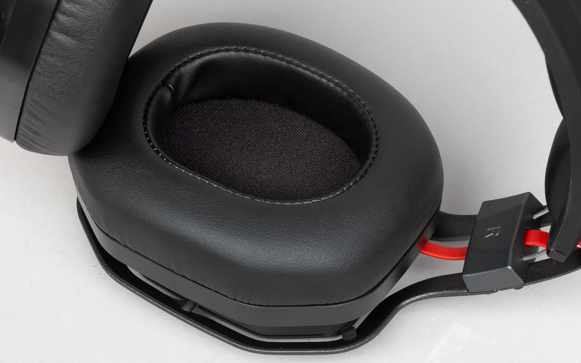 Амбушюры выполнены из экокожи с мягким наполнителем. Размер позволяет ушам практически не касаться внутренней защитной сетки и обеспечивает вполне комфортную посадку. Давление на уши небольшое. Чашки соединяет между собой плоский кабель красного цвета, минимизирующий возможность поломки от постоянного использования.