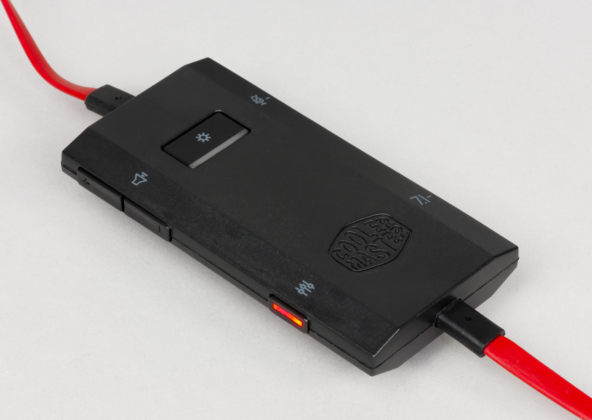 На кабеле также расположен пульт управления наушниками, являющийся звуковой картой. На лицевой стороне находится клавиша управления подсветкой с индикатором работы 7.1 звука. На правой грани находятся переключатели работы микрофона и 7.1-звучания.