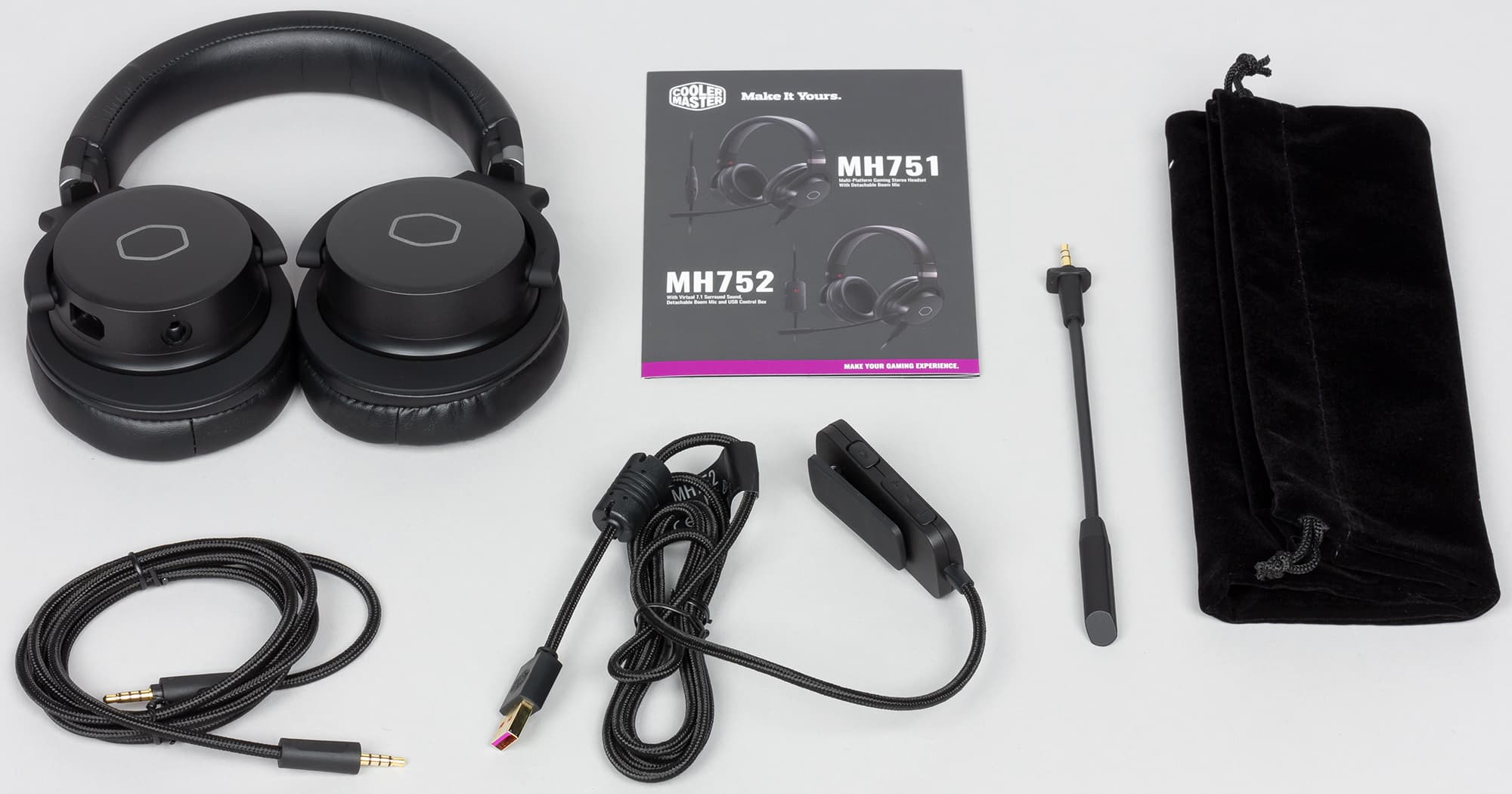 В комплекте находятся: гарнитура; 3,5 mm jack-jack кабель, USB-кабель с пультом — звуковой картой, микрофон, вельветовый чехол для транспортировки и инструкция.
