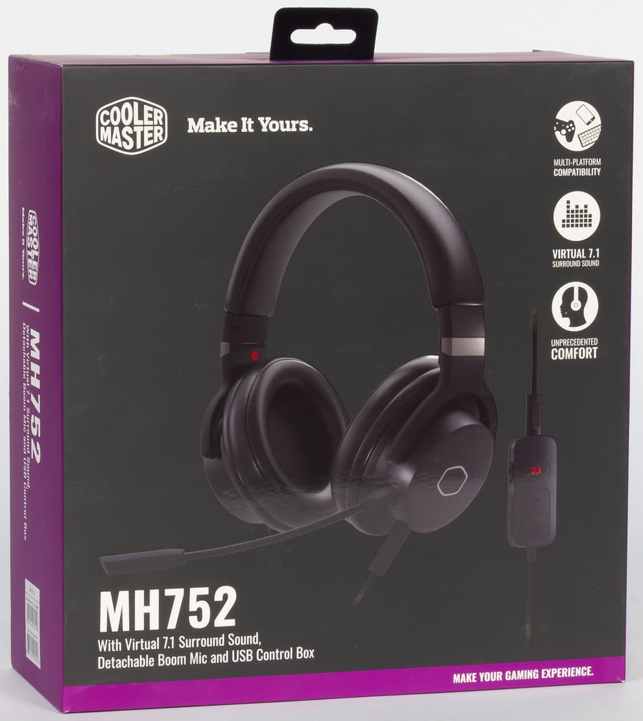 Гарнитура поставляется в плотной картонной коробке с характерным для продукции Cooler Master дизайном. На лицевой стороне — изображение устройства и название модели, на задней — основные технические характеристики.