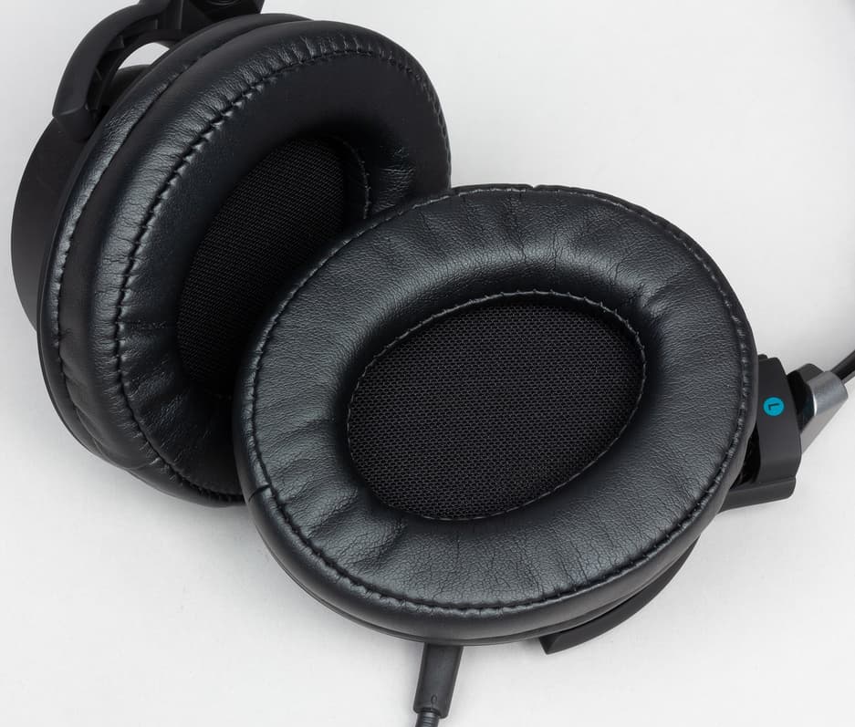 Амбушюры выполнены из искусственной кожи с мягким наполнителем. Внутри расположена решётка динамика, покрытая тканью с тонкой мягкой прослойкой. Размер амбушюр позволяет ушам не касаться защитной сетки, форма и наполнитель равномерно распределяют давление вокруг ушной раковины. Сила прилегания амбушюр весьма небольшая — в некоторые моменты наушники ощущаются на голове слишком свободно. При этом качество пассивной шумоизоляции весьма неплохое — окружающие не будут слышать происходящее у вас в наушниках.