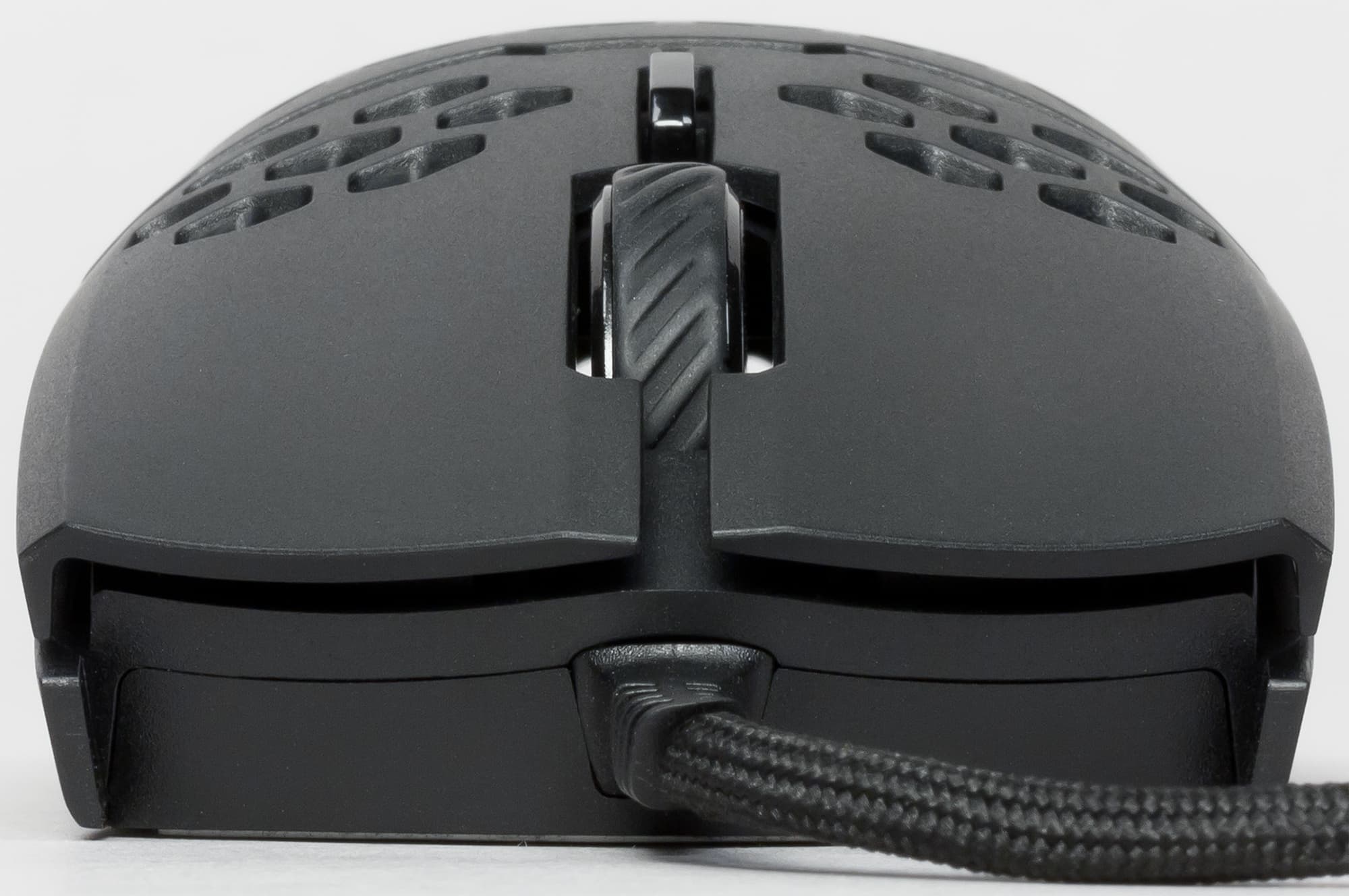Верхняя панель мыши не сплошная, и накладки на основные переключатели тоже частично перфорированы. Они закреплены не жёстко, имеют небольшой свободный ход и, если мышь трясти, постукивают о корпус. Колесо прокрутки с дискретным механизмом, крутясь, издаёт характерный звук. Кнопка DPI маленькая, она переключает разрешение сенсора между семью предустановленными значениями по возрастанию. По умолчанию это 400, 800, 1200, 1600, 3200, 6400, 16000 DPI. Значения можно изменить с помощью фирменного ПО, но об этом позже.
