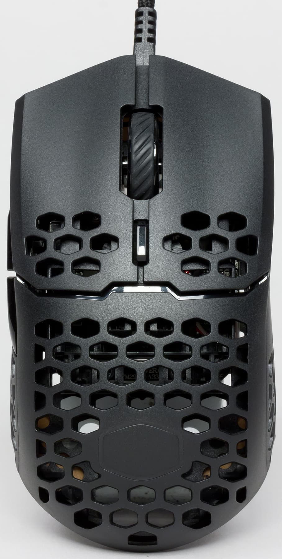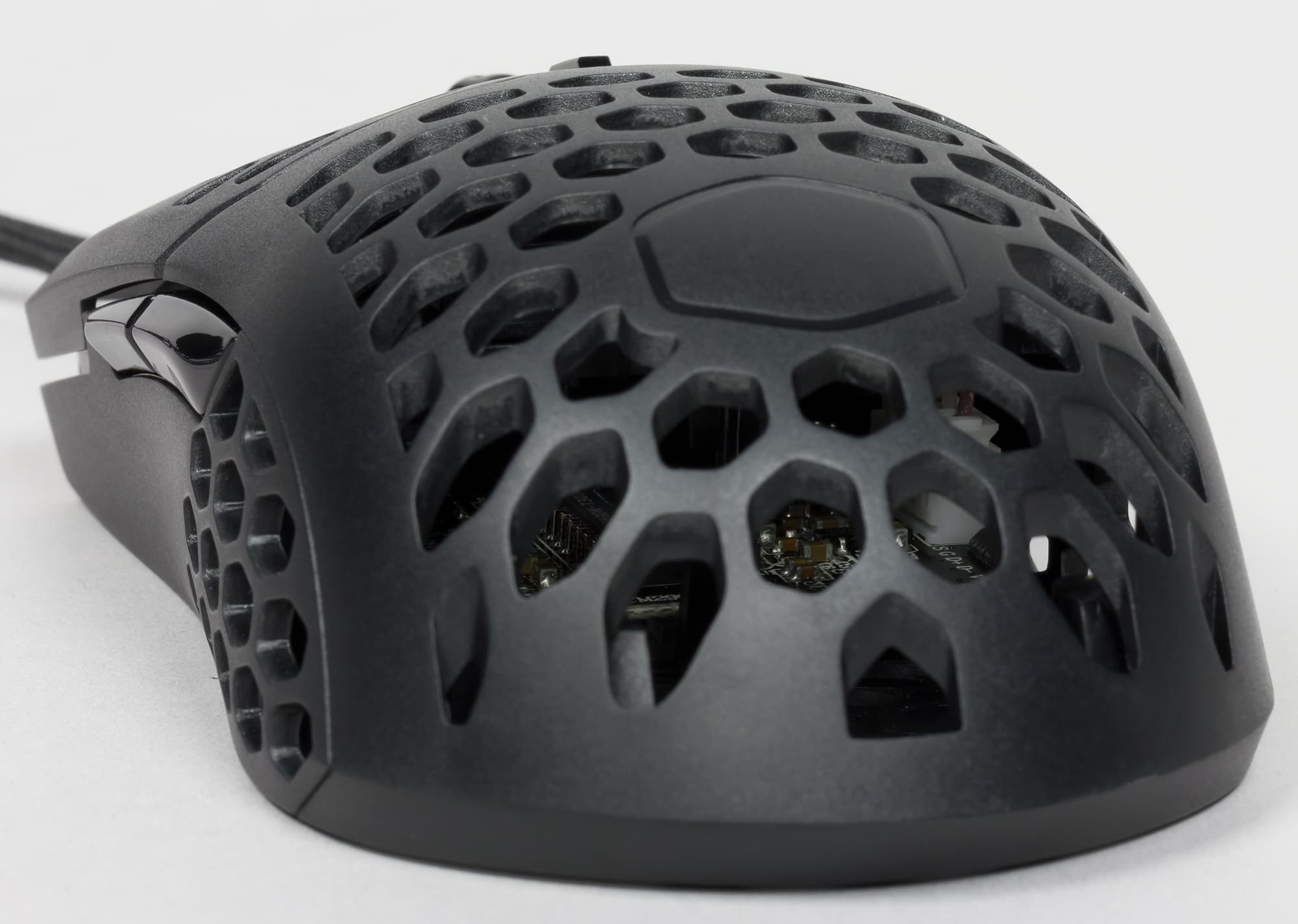 Корпус сделан из матового пластика и почти весь перфорирован. Буквально: через мышь можно смотреть на окружающий мир. Выглядит такой дизайн и забавно, и необычно, и чрезвычайно круто. Сделано это, конечно же, для уменьшения массы устройства. Вряд ли такое решение придаёт прочности корпусу: при сильном нажатии пальцами он едва заметно, но всё же прогибается, и, если вы наступите на манипулятор, то корпус разлетится на части.