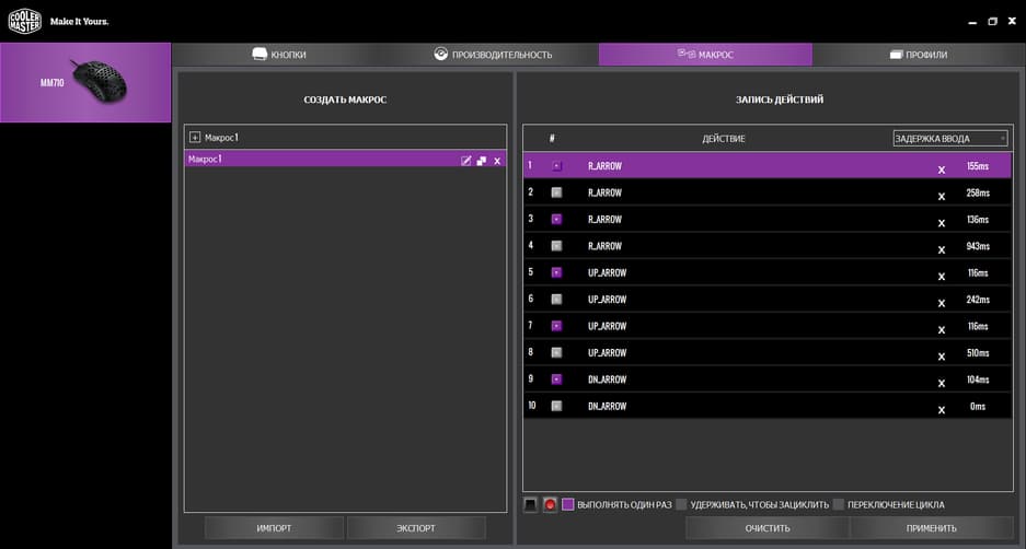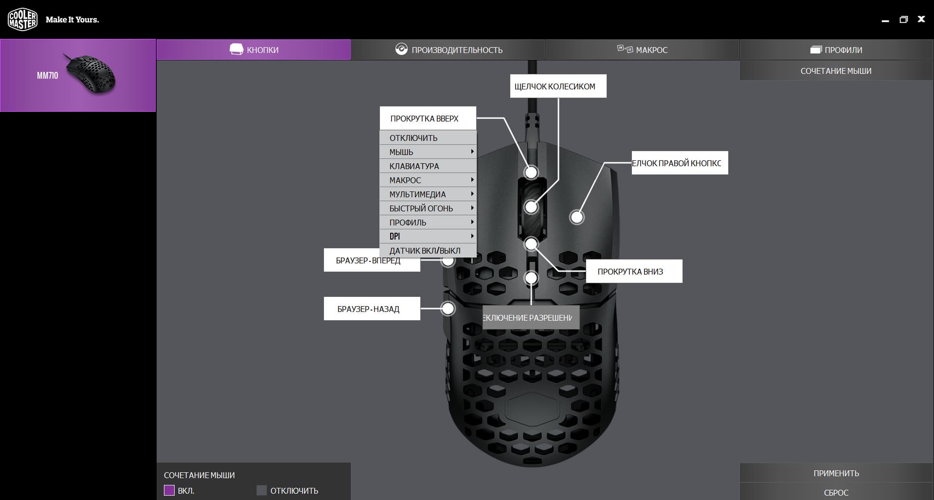 Cooler Master MM710 настраивается через фирменное приложение MasterPlus+, причём настраивается здесь вообще всё: и клавиши, и даже прокрутка колеса. Таким образом, у мышки шесть программируемых кнопок, а ещё две функции можно поставить на скроллинг, что даёт внушительные возможности кастомизации. Интересно, что на отдельную клавишу можно вынести даже отключение/включение сенсора.