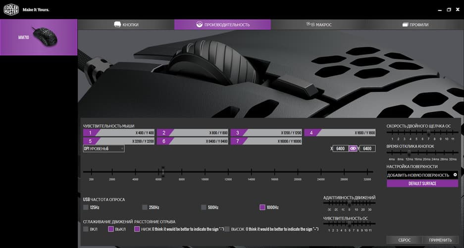 Тонкая настройка проделывается в меню «Производительность». Здесь можно поменять значения для всех семи режимов DPI, настроить отклик клавиш, а также откалибровать устройство по поверхности.